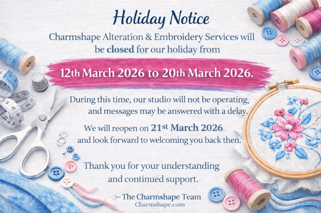 I ‘am Kate, the owner of Charmshape Custom Embroidery, Tailoring and Alterations Services , and I have over 23 years of experience in clothing alterations and custom embroidery. I can modify almost anything, but if there’s a rare instance where I can’t complete a particular alteration, I will let you know upfront. Due to a high demand for my services, I usually require a minimum of 5-10 business days to complete alterations. Unfortunately, I am unable to accommodate same-day requests. However, if you have a deadline that you need your item(s) ready by, please let me know, and I will make sure to meet that date.